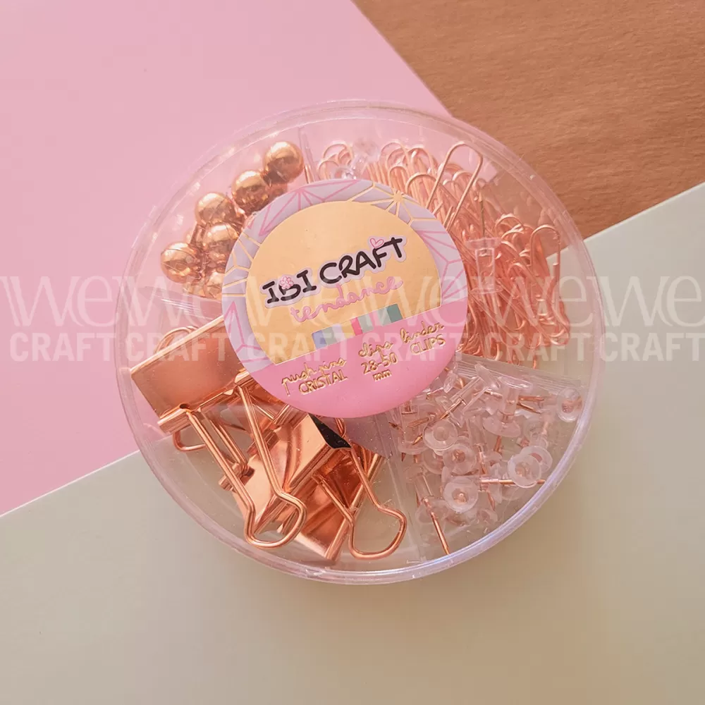 Práctico set de escritorio redondo IBI CRAFT TENDANCE compuesto por: 50 pins para tableros de corcho, 30 clips de 28mm, 20 clips de 50mm y 4 aprieta papeles de 25mm, todo en brillante tono oro rosa (rose gold).